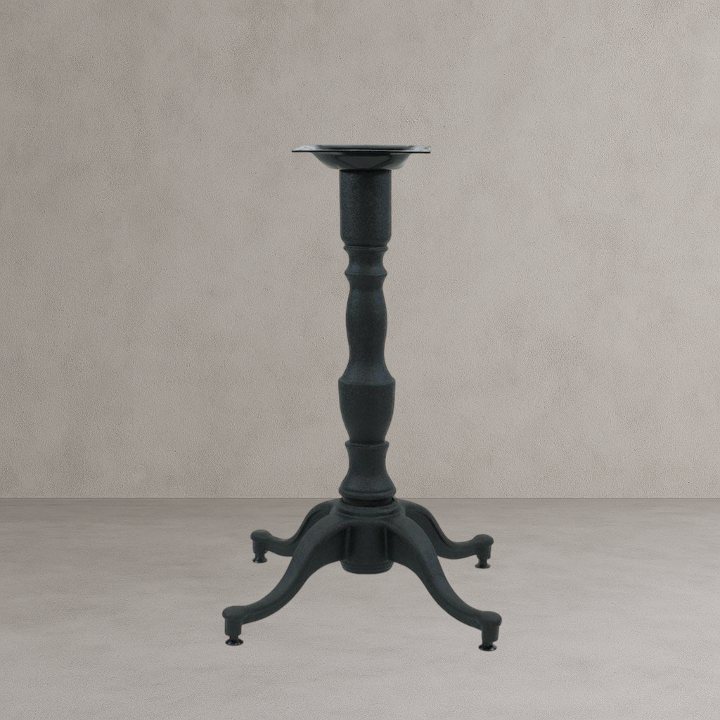 The 1000 series table base features full cast iron construction to build a steady table even with heavy granite or marble tops. This decorative table base features a black powder coat finish resists corrosion, and blends seamlessly in any cafe, diner, bar, pub, or restaurant dining areas.