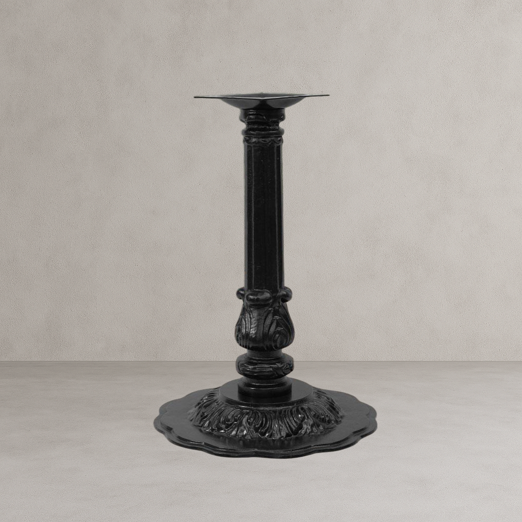 The B2C5 ornamental table base and column are high quality European style with a black textured finish, perfect for interior use in any dining, restaurant, cafe, diner, home, or commercial environment. This fully cast iron decorative table base features a spread of 48 inches for dining height and is strong enough to support heavy tabletop materials such as granite and marble without any flexing.