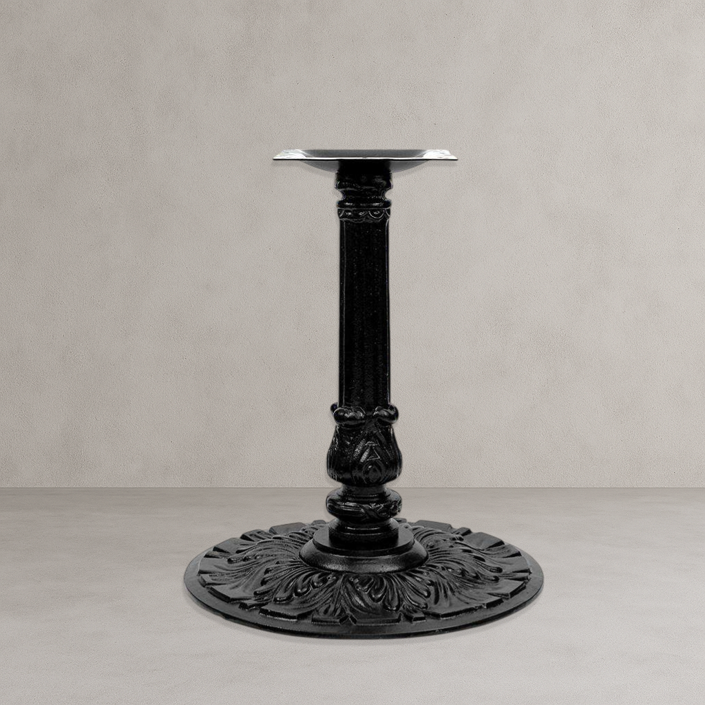 Our B1 ornamental table base and column is a high-quality, European style in black texture finish, and is perfect for indoor use in any dining, restaurant, cafe, or commercial environment. This table base features a 24'' base size and cast iron mounting plate with a 3" diameter steel column. It can blends seamlessly in any cafe, diner, bar, pub, or restaurant dining area.